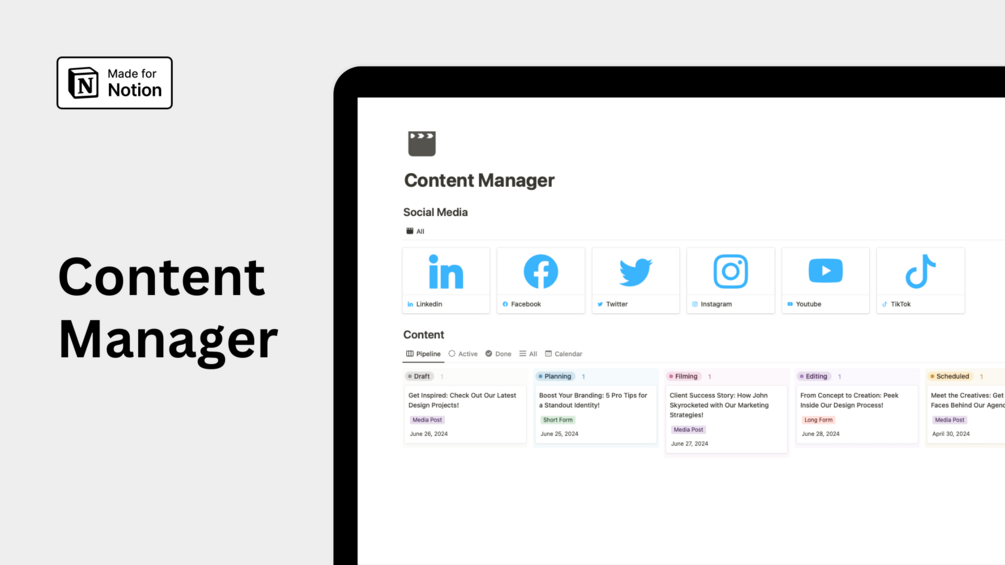 Elevate your content creation process with our Notion Content Manager template. Designed for organization and efficiency, this tool helps you plan, create, and manage your content all in one streamlined interface.