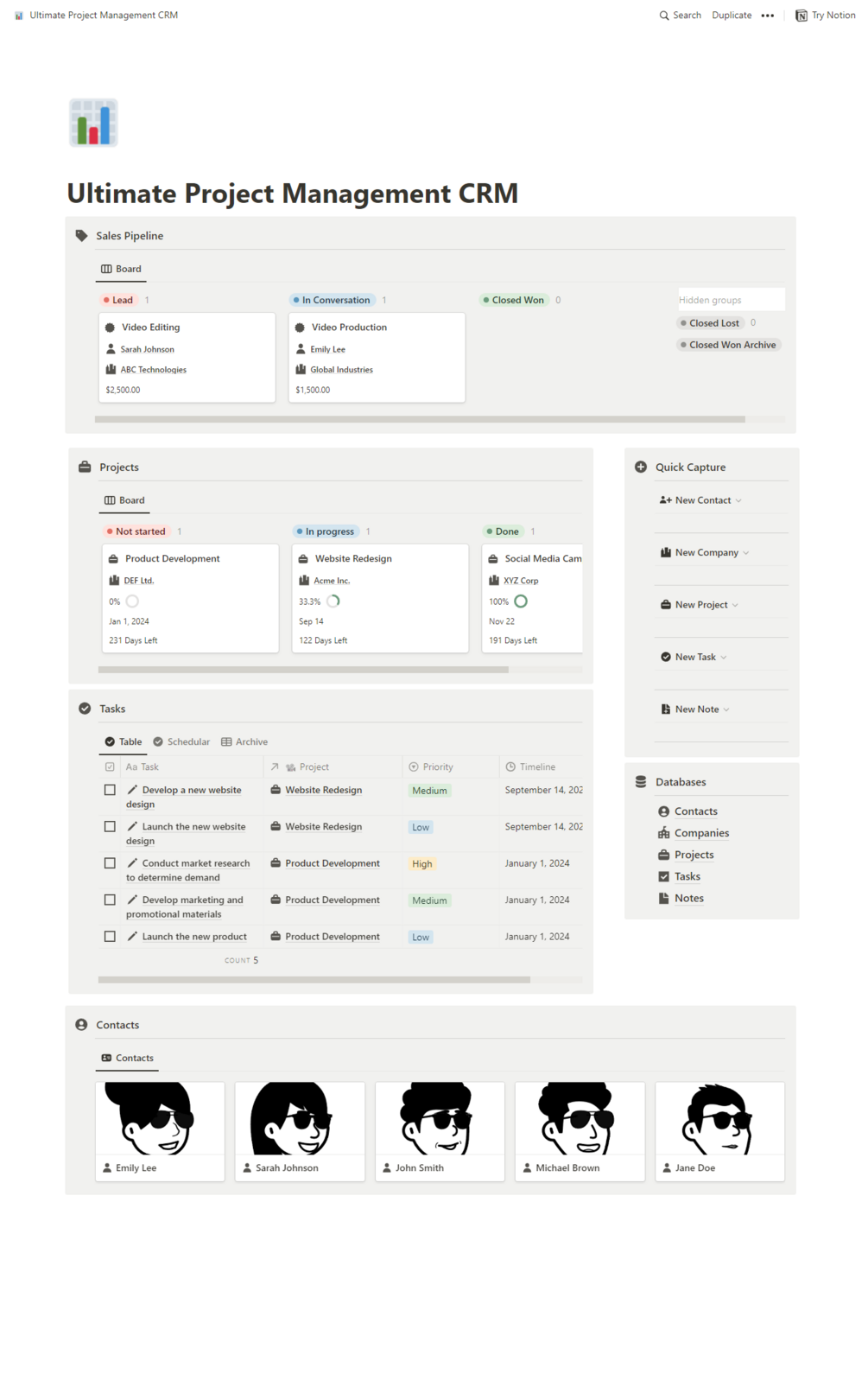 Introducing our comprehensive CRM Notion template - the ultimate solution for managing your sales pipeline, projects, tasks, contacts, companies, and notes all in one convenient place.