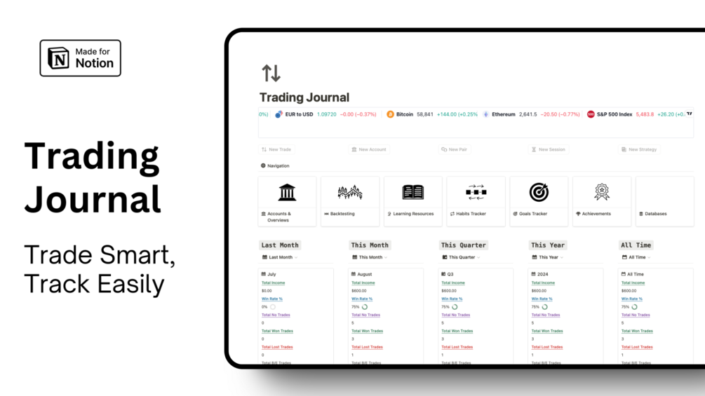 Ready to elevate your trading game and ensure consistent profitability? Introducing the Profitable Trading Journal—a meticulously crafted Notion template designed to help you track, analyze, and optimize your trading performance. Whether you’re a seasoned trader or just starting out, this tool will keep you organized, focused, and on the path to financial success.