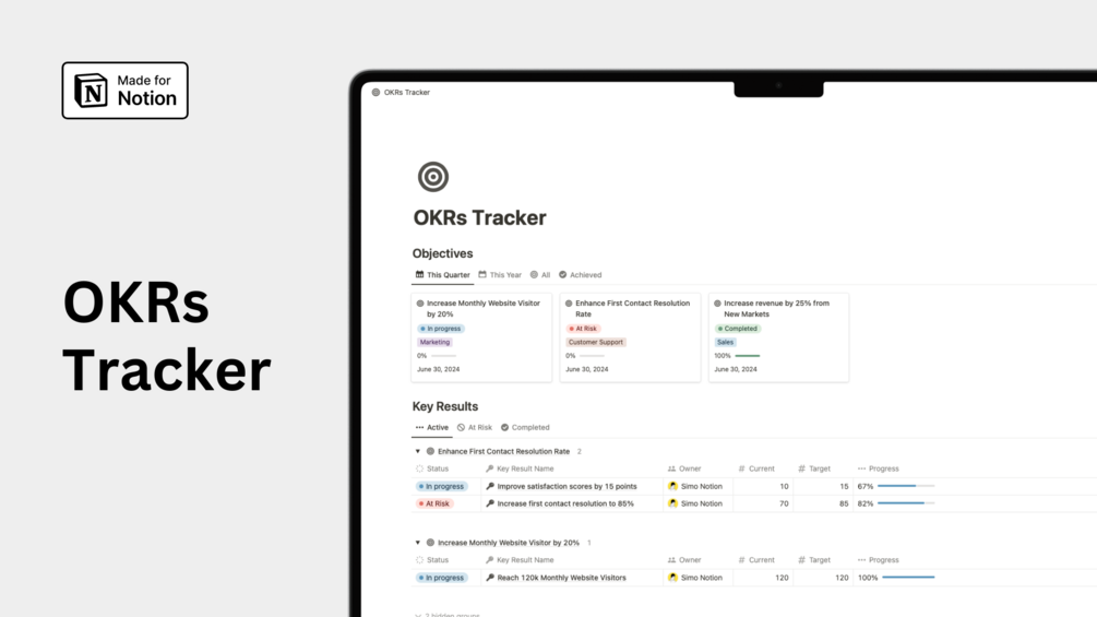 This OKRs Tracker Notion template simplifies managing Objectives and Key Results (OKRs), providing a structured platform to set ambitious goals and track progress effortlessly.