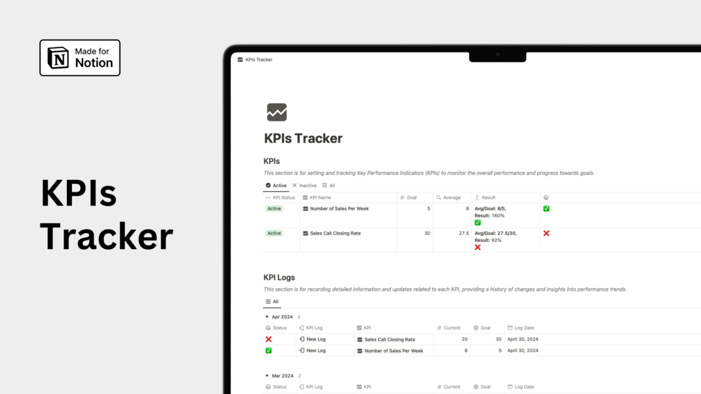 This KPIs Tracker simplifies monitoring your Key Performance Indicators (KPIs) by providing dedicated sections for setting goals and logging progress updates.
